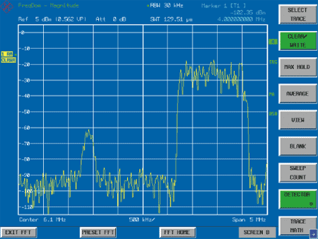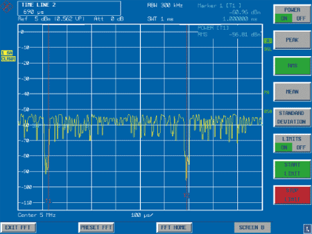 ?對于頻率選擇性測量,時域分析測量可以提供更多的有意義信息。例如,測量靠近強信號的微弱脈沖信號,使用R&S FMU36可以濾出脈沖信號,同時輕松測量脈沖持續(xù)時間和功率,這是傳統(tǒng)的FFT分析儀不具備的功能。采用R&S FMU36可以單獨設置中心頻率和分辨率帶寬。