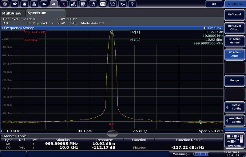 相位噪聲在1GHz中心頻率,10kHz偏離處為 -137dBc(1Hz)