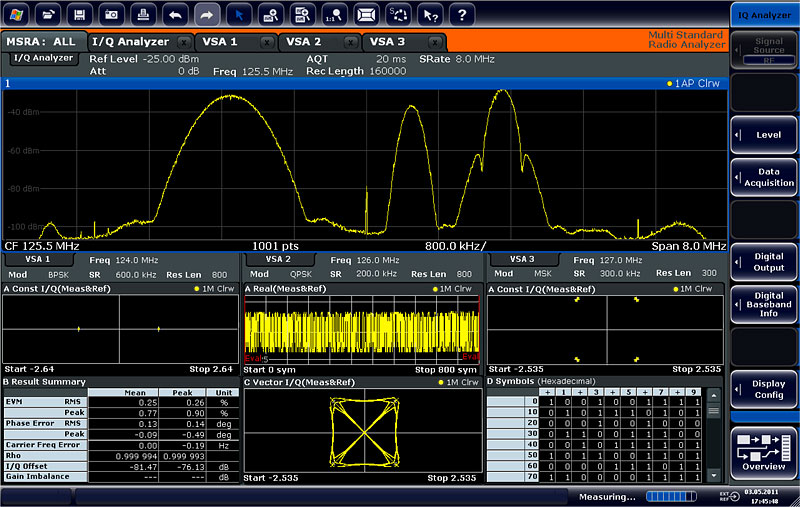 R&S?FSW提供新多標(biāo)準(zhǔn)無線分析儀功能,此功能在FSW的160MHz分析帶寬內(nèi)可以同時(shí)測(cè)量處于不同頻率點(diǎn)的不同標(biāo)準(zhǔn)信號(hào)(比如GSM, WCDMA, LTE信號(hào))