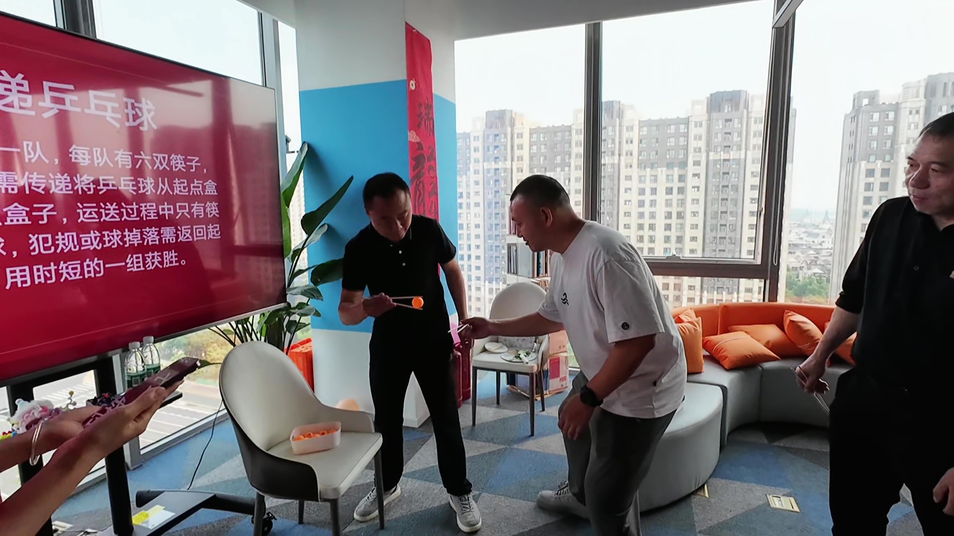 有人的“筷子功夫”出神入化,但在傳遞過程中也還是免不了手忙腳亂,在經(jīng)歷了乒乓球幾次落地后,大家也逐漸找到了手感。