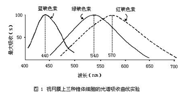 當(dāng)人們做這個(gè)實(shí)驗(yàn)的時(shí)候,有個(gè)驚人的發(fā)現(xiàn),那*是:發(fā)現(xiàn)了視網(wǎng)膜上不同的視錐細(xì)胞對(duì)光譜存在著三種不同的吸收,因而*出現(xiàn)了三種不同的吸收曲線。下面的曲線圖*是其一。只不過是,該圖把三種不同的視錐細(xì)胞的光譜吸收曲線畫在同一張圖上了(該圖選自劉家琦,李鳳嗚主編的《實(shí)用眼科學(xué)》第二版.北京人民衛(wèi)生出版社,1999年版.第50頁)。這張圖的意思是,用400nm到700nm的色光去單獨(dú)照射每個(gè)視錐細(xì)胞時(shí),其結(jié)果是:反射回來的光的數(shù)量并不是一樣多,而是有三種。因而,*繪制出了三種不同的吸收曲線圖。并且,這三條曲線各自占據(jù)了光譜中的藍(lán)區(qū)、綠區(qū)、紅區(qū)的不同位置。因此人們便依據(jù)這一點(diǎn)得出了,視網(wǎng)膜接受外界光線刺激時(shí),可以產(chǎn)生出紅、綠、藍(lán)三種原色的觀點(diǎn)。