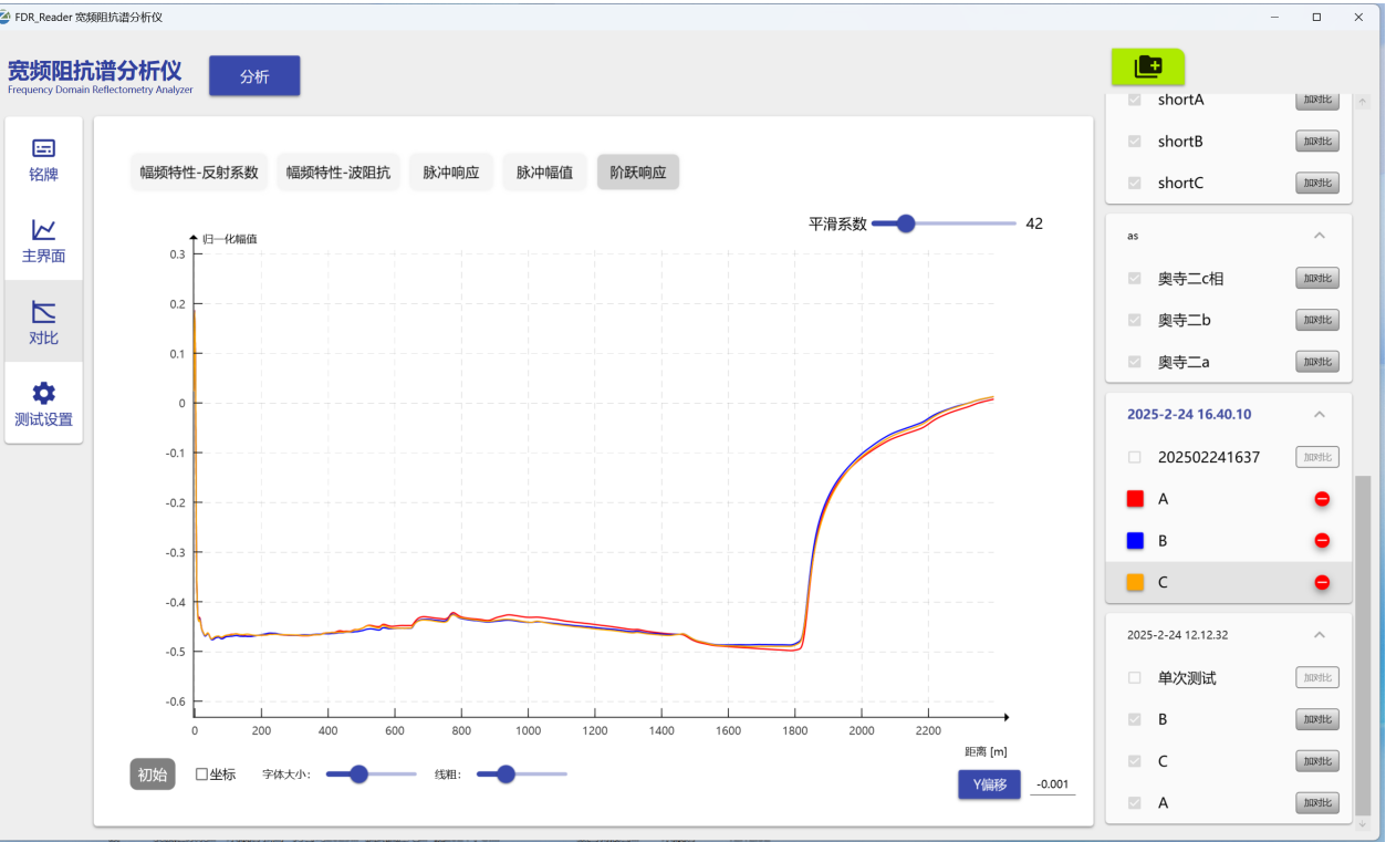 通過對A、B、C三相階躍響應(yīng)結(jié)果對比分析發(fā)現(xiàn),在879.04米處,三相的波阻抗歸一化幅值出現(xiàn)了明顯的分層階躍后大幅下降,該位置導(dǎo)致三相絕緣降低; 同時在650.25米處也出現(xiàn)了三相的階躍增幅,疑似該處發(fā)生了進(jìn)水,建議條件允許的情況下進(jìn)行檢查維護(hù)。