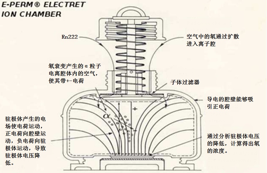氡在離子腔中發(fā)生阿爾法衰變,阿爾法粒子攜帶能量,將空氣電離帶正負(fù)電荷。駐極體帶有700-780V電壓,在離子腔中形成電場(chǎng),正負(fù)電荷在電場(chǎng)中運(yùn)動(dòng)。正電荷接觸導(dǎo)電腔壁,被導(dǎo)出儀器。負(fù)電荷接觸駐極體,使駐極體電壓降低。使用電壓讀數(shù)器讀取駐極體電壓,通過電壓降低的多少和測(cè)量時(shí)間計(jì)算氡濃度。