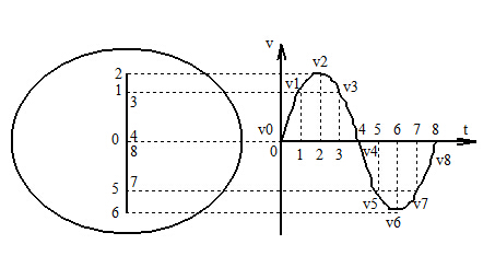 如果將被測(cè)信號(hào)電壓加到垂直偏轉(zhuǎn)板上,鋸齒波掃描電壓加到水平偏轉(zhuǎn)板上,而且被測(cè)信號(hào)電壓的頻率等于鋸齒波掃描電壓的頻率,則熒光屏上將顯示出一個(gè)周期的被測(cè)信號(hào)電壓隨時(shí)間變化的波形曲線(如下圖所示)。由下圖所示可見(jiàn),在時(shí)間t=0的瞬間,信號(hào)電壓為Vo(零值),鋸齒波電壓為V0′(負(fù)值),熒光屏上光點(diǎn)在坐標(biāo)原點(diǎn)左面,位移的距離正比于電壓V0′;在時(shí)間t=1的瞬間,交流電壓為V1(正值),鋸齒波電壓為V1′(負(fù)值),熒光屏上光點(diǎn)在坐標(biāo)的第Ⅱ象限中。同理,在時(shí)間t=2,t=3,…,t=8的瞬間,熒光屏上光點(diǎn)分別位于2,3,…,8點(diǎn)。在t=8瞬間,鋸齒波電壓由*大正值V8′跳變到*大負(fù)V0′,因而熒光屏上的光點(diǎn)也從8點(diǎn)極其迅速地向左移到起始位置0點(diǎn)。以后,在被測(cè)周期信號(hào)的第二個(gè)周期、第三個(gè)周期……都重復(fù)*個(gè)周期的情形,光點(diǎn)在熒光屏上描出的軌跡也都重疊在*次描出的軌跡上。所以,熒光屏上顯示出來(lái)的被測(cè)信號(hào)電壓是隨時(shí)間變化的穩(wěn)定波形曲線。