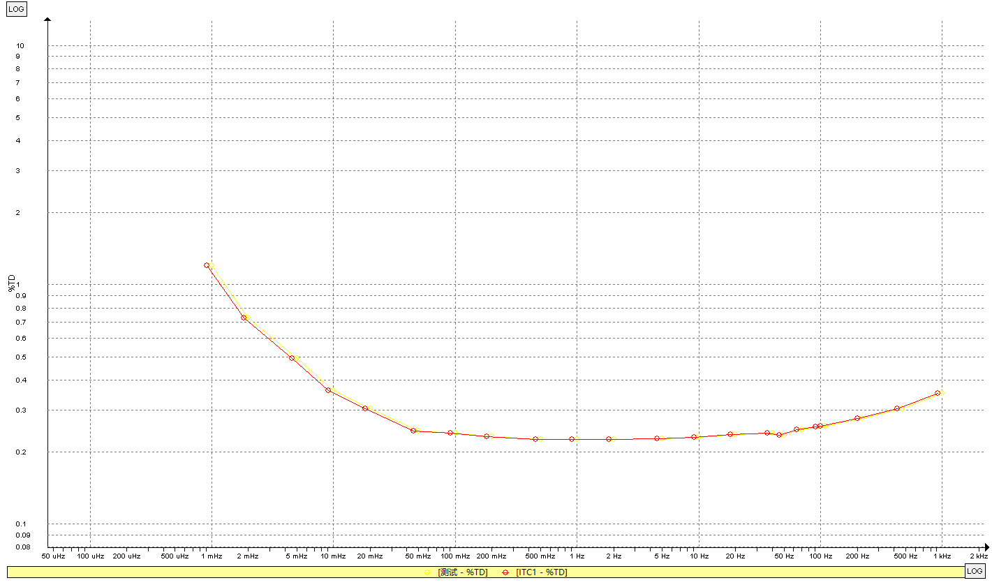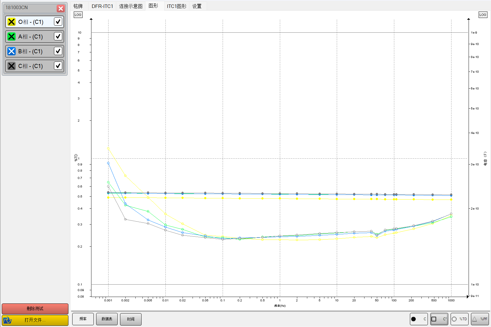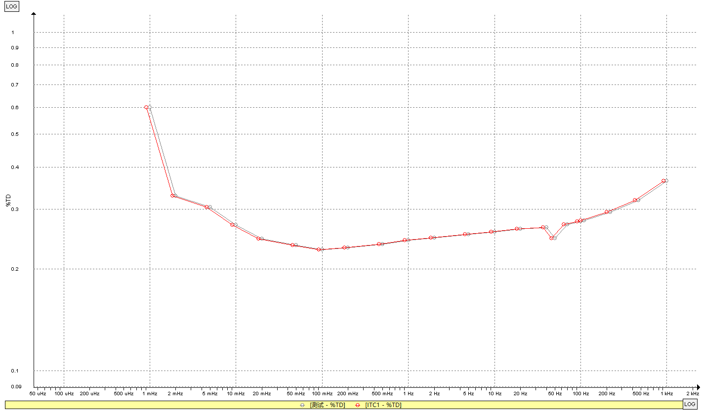 可以看到,測試結(jié)果曲線與模型曲線十分平滑且基本一致。模型曲線與測試曲線有偏移的原因是溫度不同。(介質(zhì)譜分析測試的是各個不同頻率下的電容值和介損值,并繪制成電容和介損的頻率曲線。介質(zhì)譜曲線能夠更為清晰地反映絕緣的狀態(tài),并且有助于判斷測試結(jié)果是否存在異常。介損隨頻率改變,從左到右頻率逐次增大。)
